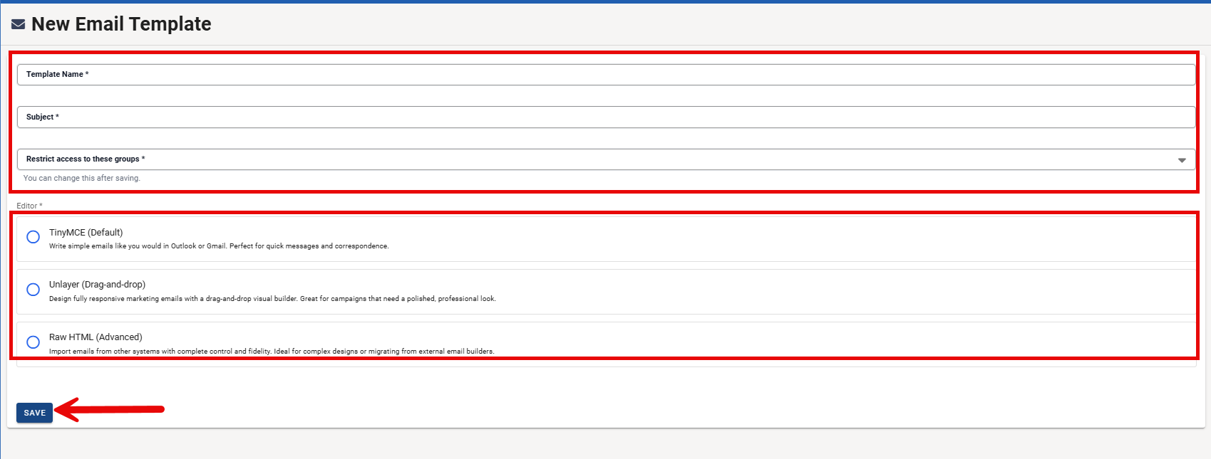 This page allows you to create a new email template. Enter the required information—template name, subject line, and access permissions—select the editor you want to use to design your email content, then click Save.