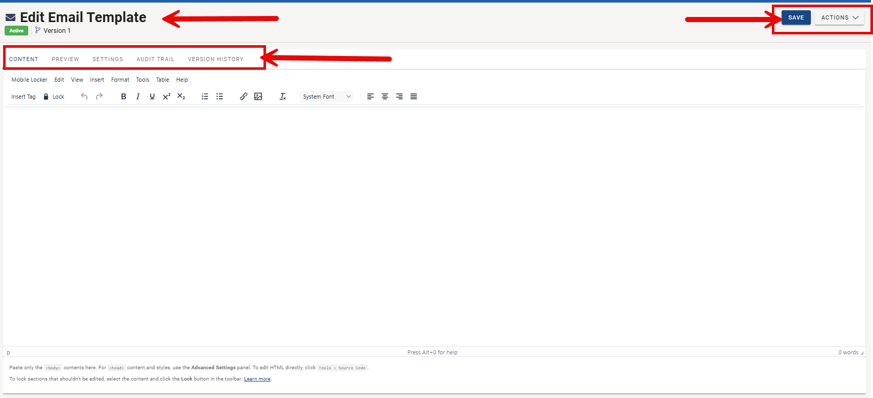 Access additional template options by clicking the ACTIONS dropdown (top-right corner, next to SAVE).