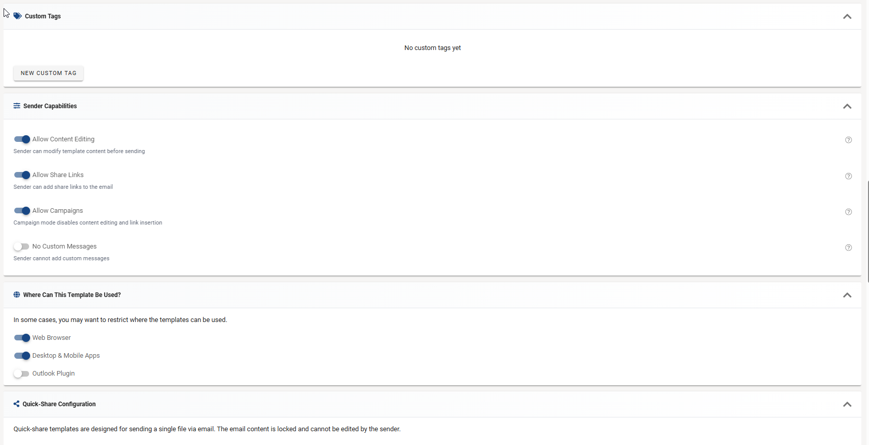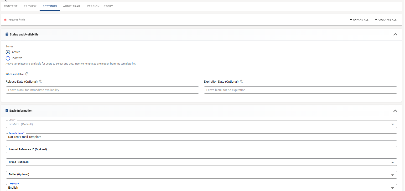 The Settings tab allows you to configure essential template properties, including availability, basic information, and access permissions. Changes made here control who can use the template and when it's available.