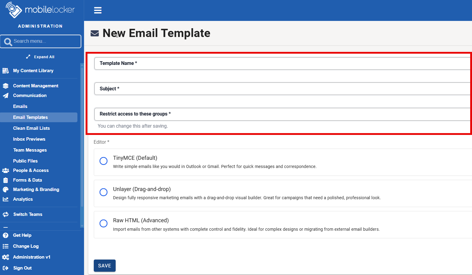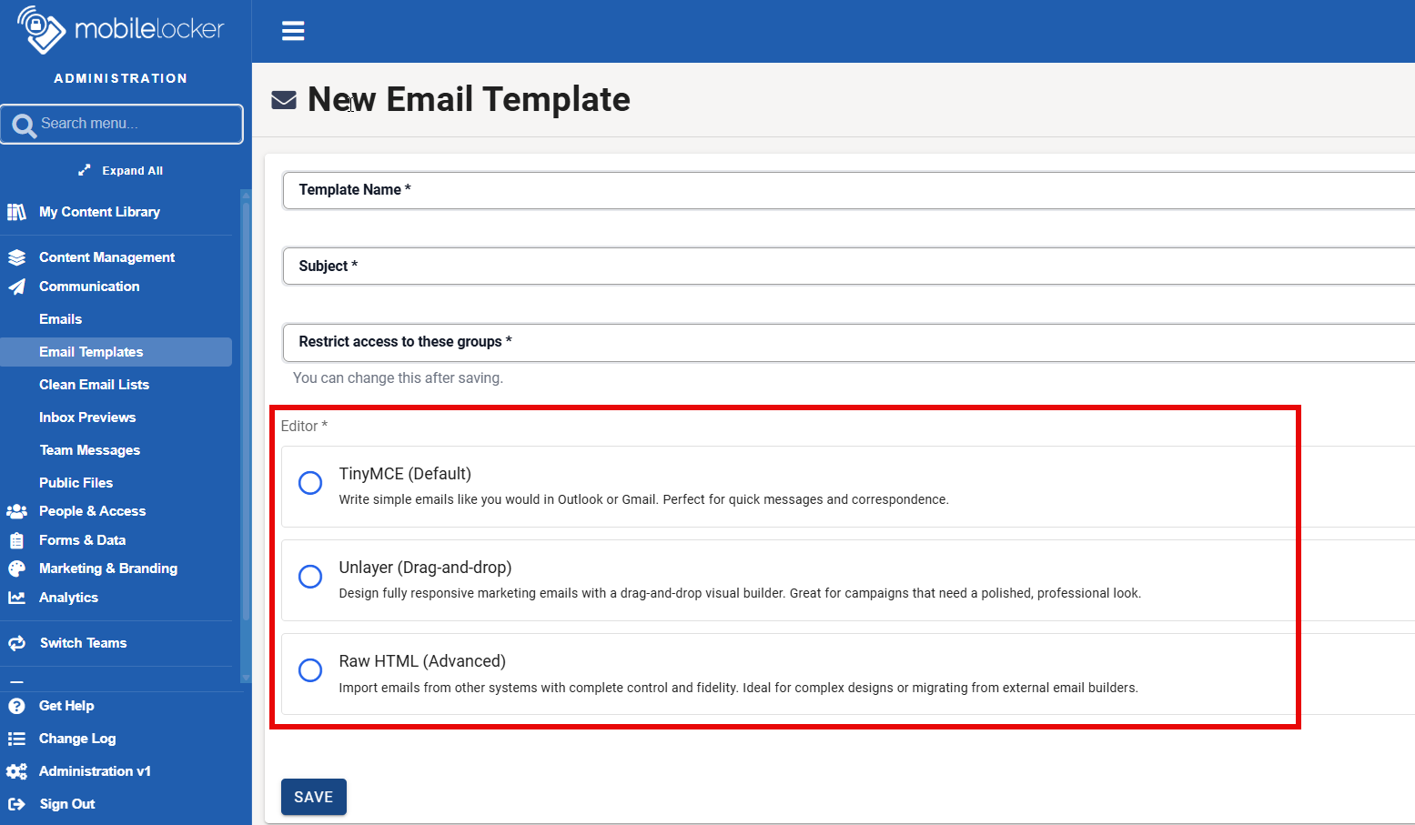 Email editors are a way to personalize and customize email templates within the Mobile Locker Platform. But it's important to understand that before you begin, you must first select TinyMCE or Unlayer Editor from the Email Template Workspace.
