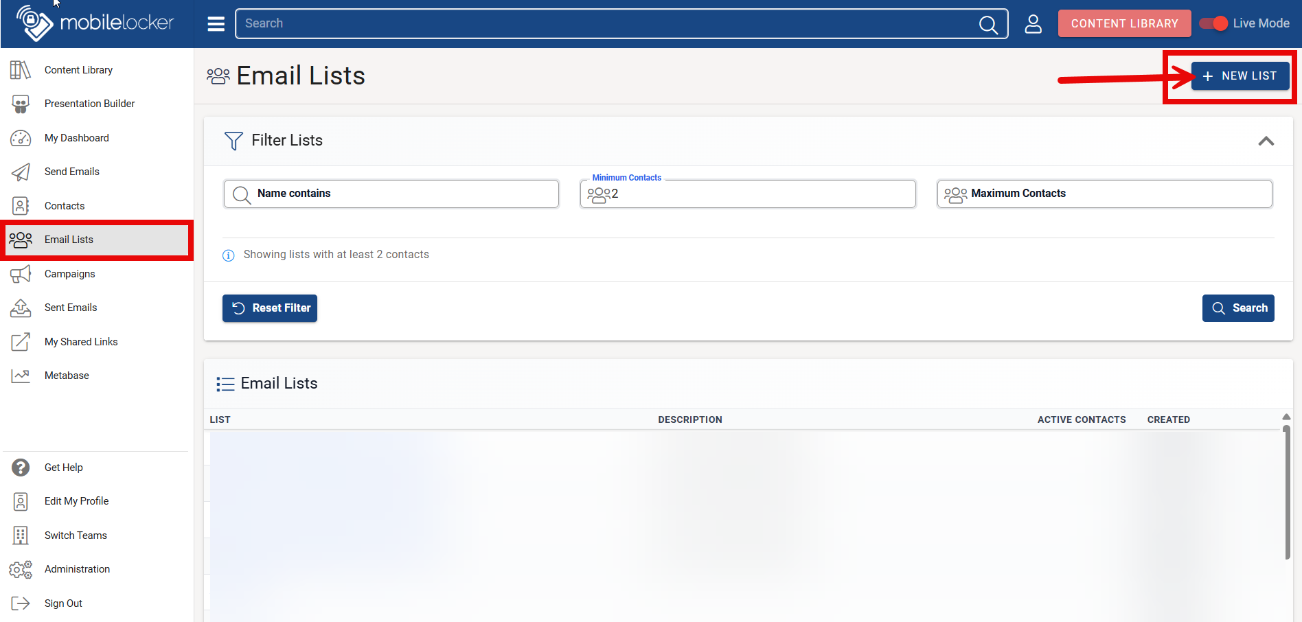 Mobile Locker makes it easy to create email lists directly from your contacts, enabling you to manage and send targeted communications. Follow the steps below to create and manage your email lists.
