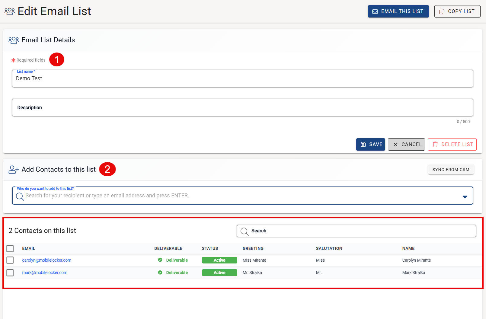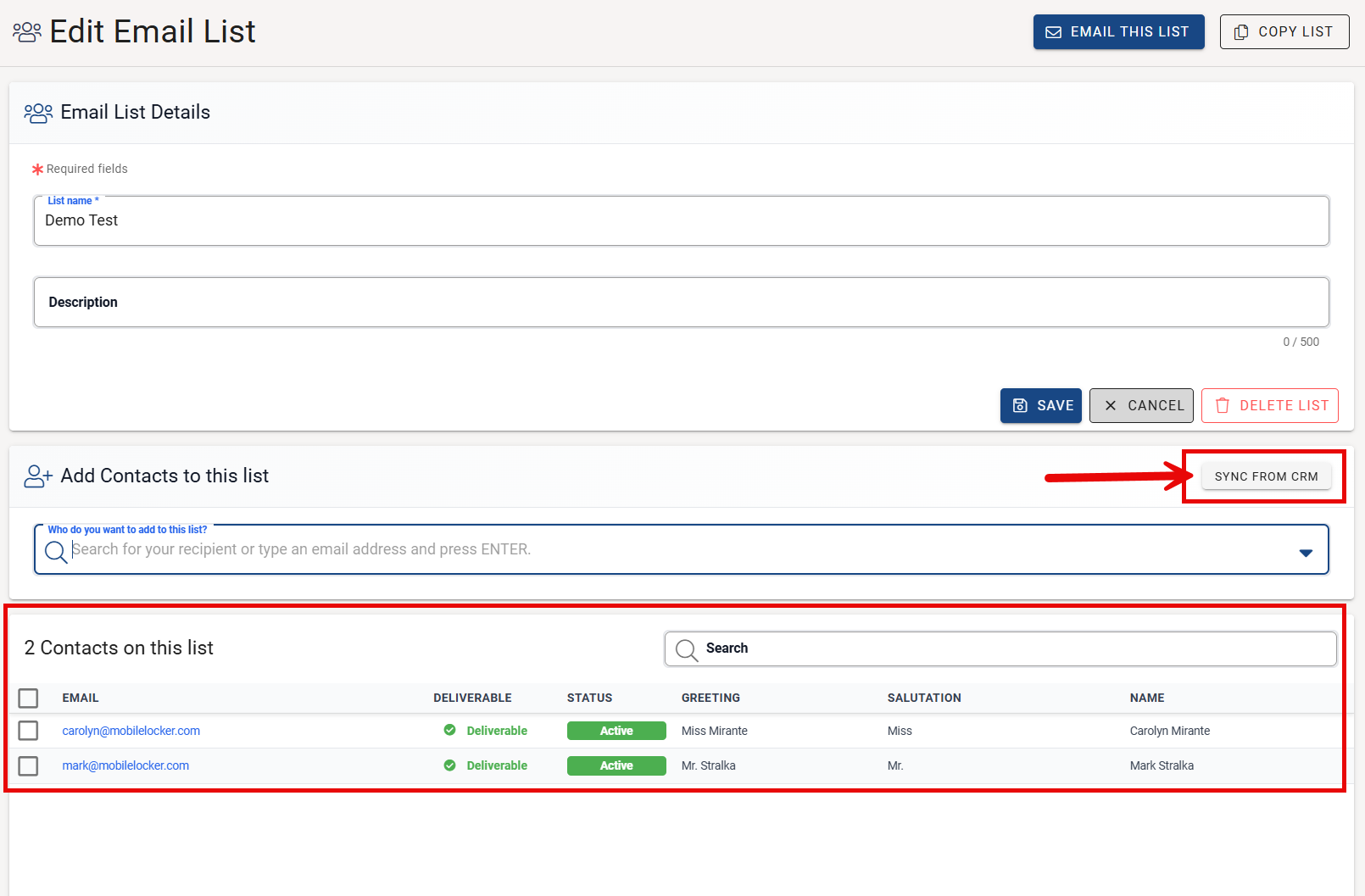 The recipients will now be added to the new list. You also have the option to click Sync from CRM to import additional contacts.