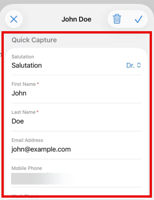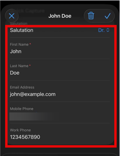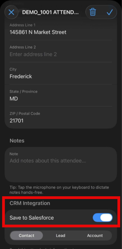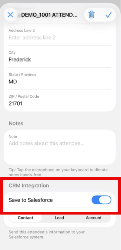 If your CRM is integrated with Mobile Locker, you can save this as a CRM contact by toggling the Save to Salesforce option. Note: The toggle updates with your CRM name.