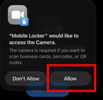 When you scan a badge for the first time, a camera permission prompt will appear. Please click "Allow" to grant Mobile Locker access to your camera, which is necessary for scanning barcodes and QR codes.