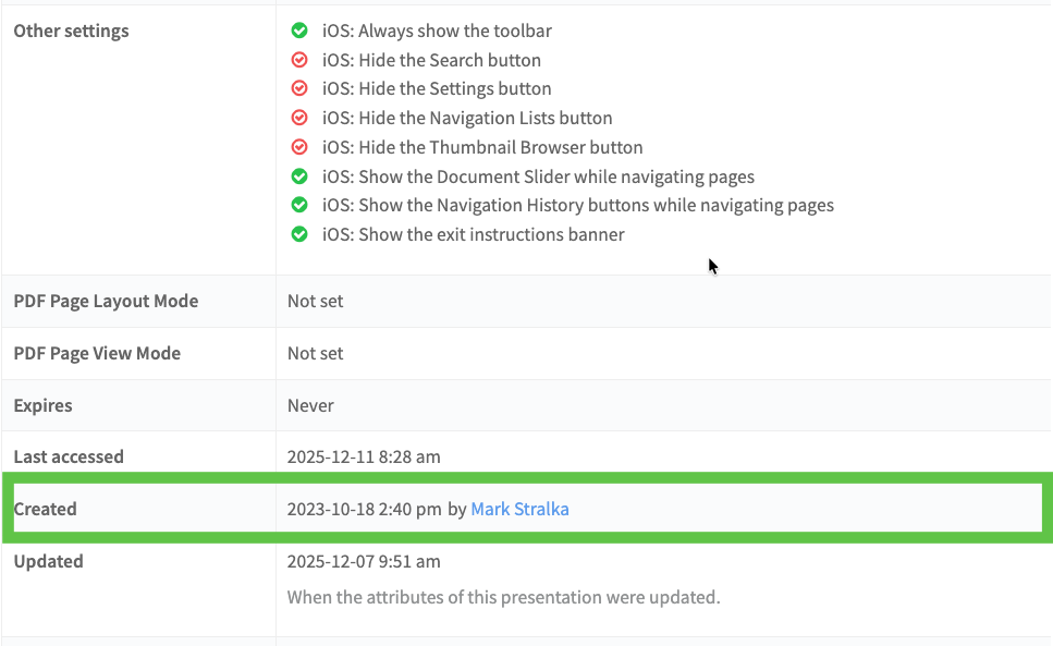 You can now view presentation creators right from the Presentation screen. Scroll down to the "Created" section to see the name.