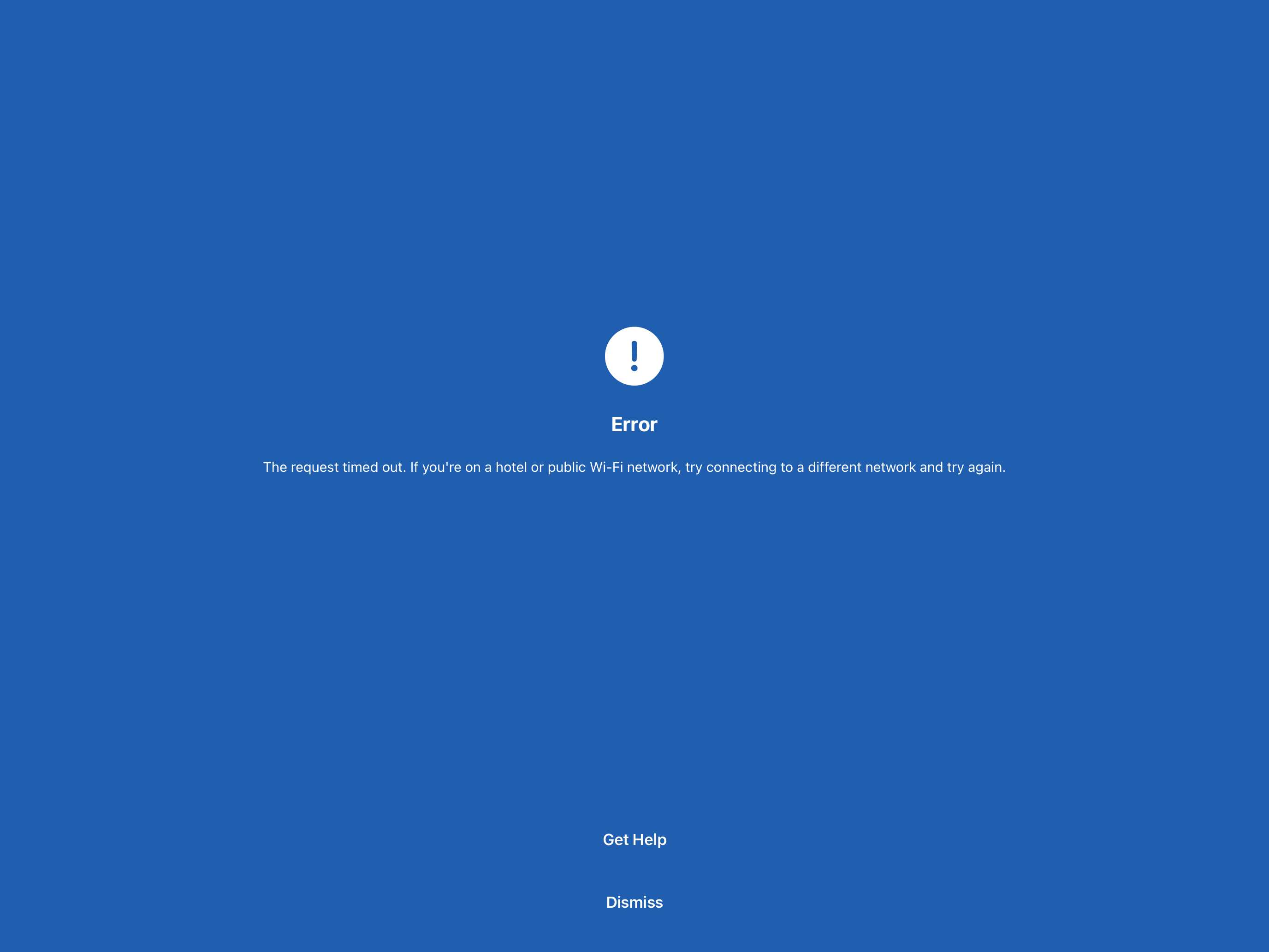 "The request timed out. If you're on a hotel or public Wi-Fi network, try connecting to a different network and try again."
